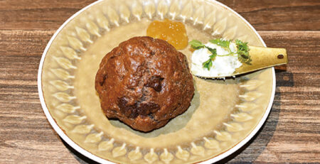紅茶に漬け込んだクランベリーやブルーベリーなどのドライフルーツをふんだんに練り込んだスコーンは期間限定スイーツ。自家製ルバーブのジャムとクロテッドクリームをたっぷりつけてアフタヌーンティを楽しんで。